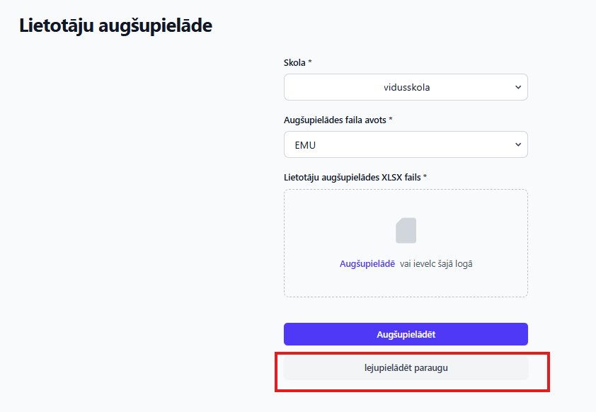 - Sekojot paraugā aprakstītām norādēm, aizpildīto failu pievienojiet Lietotāju augšupielādes XLSX fails sadaļā un tad spiediet Augšupielādēt.